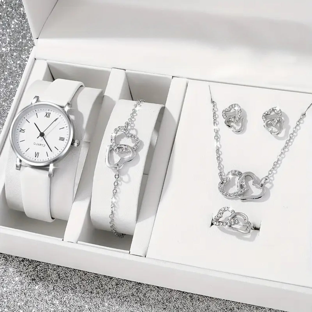 Women'S 6pcs Quartz Watch Set, Simple Round Dial, PU Leather Strap, Heart-Shaped Pendant Necklace, Bracelet, Earrings, Ring, Alloy Case, Quartz Movement, Non-Wireless, Non-Chargeable Battery, Ideal Gift for Women.